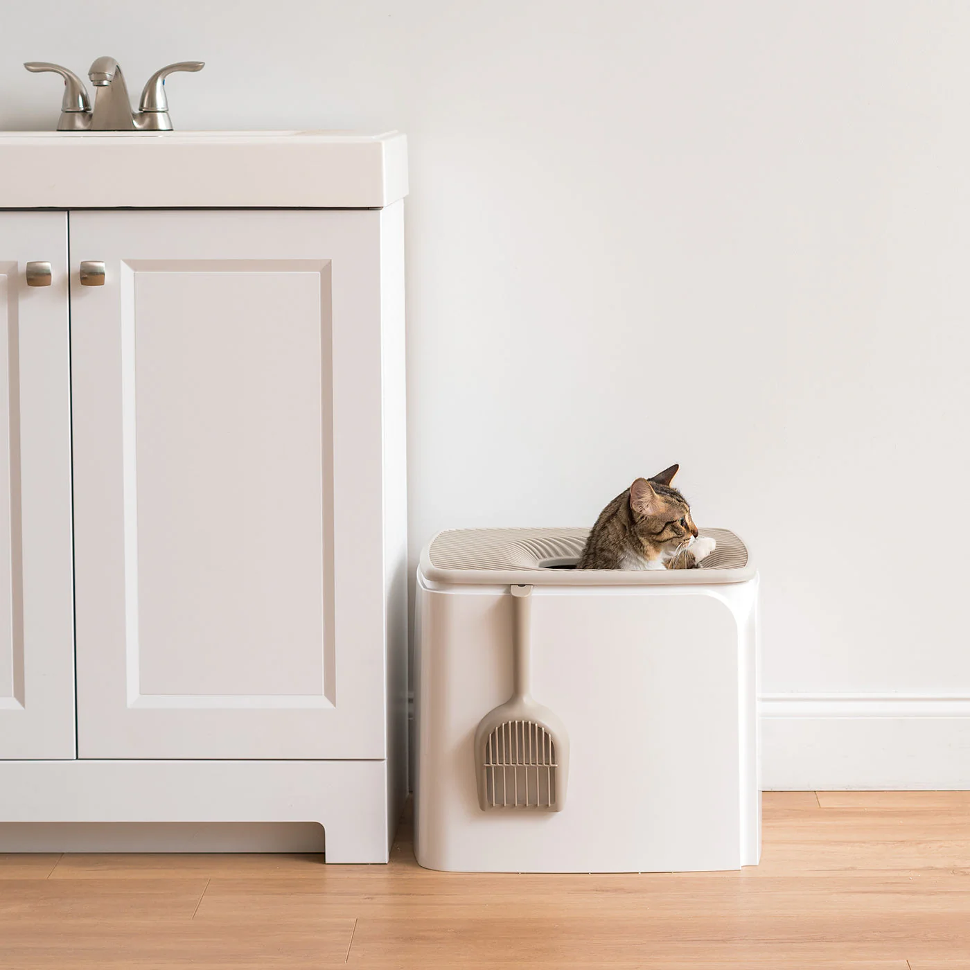- TOP ENTRY - The top entry of the cat litter pan means more privacy for your cat, less litter spillage, and any spraying remains contained within the tall walls of the kitty litter box. It also functions to keep other pets, such as dogs, out of your cat's business, making for a stress-free environment for everyone.